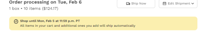 Three days before your recurring order ships, we'll notify you via email or text message to review the items in your order. You can add, remove, and edit quantities of items up until 11:59pm the day before your box is scheduled to process.